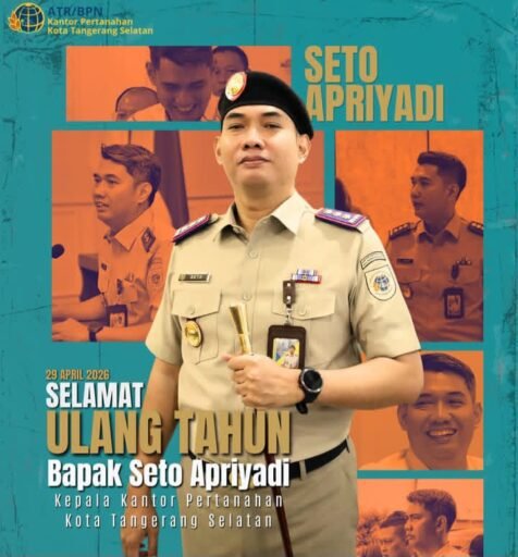 Tangerang Selatan, 29 April 2026 — Keluarga besar Kantor Pertanahan Kota Tangerang Selatan dengan penuh rasa hormat dan kebanggaan menyampaikan ucapan selamat ulang tahun kepada Bapak Seto Apriyadi, S.S.T., M.H., Kepala Kantor Pertanahan Kota Tangerang Selatan, yang pada hari ini, Rabu, 29 April 2026, genap bertambah usia.