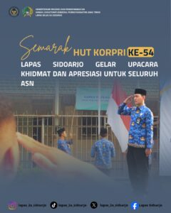 Dalam rangka memperingati Hari Ulang Tahun Korps Pegawai Republik Indonesia (KORPRI) ke-54, Lembaga Pemasyarakatan Kelas IIA Sidoarjo melaksanakan upacara peringatan yang berlangsung secara khidmat dan penuh semangat di lapangan apel Lapas, Rabu pagi. Kegiatan ini menjadi momentum penting bagi seluruh Aparatur Sipil Negara (ASN) untuk memperteguh komitmen pengabdian dan profesionalitas dalam memberikan pelayanan terbaik kepada masyarakat.
