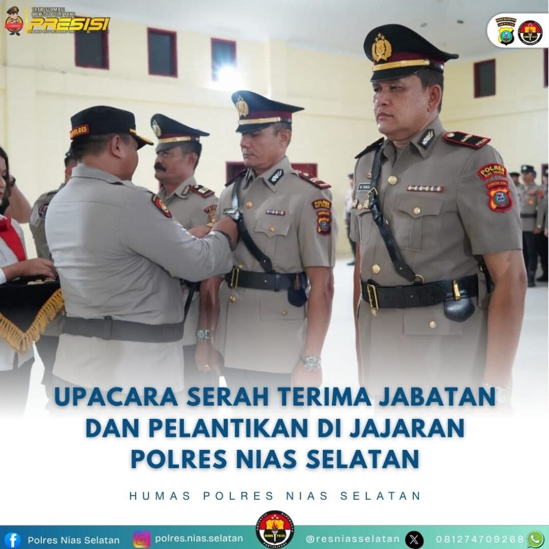 Dalam upacara tersebut, dilakukan pengambilan sumpah jabatan dan penandatanganan Pakta Integritas oleh pejabat baru dan pejabat lama. Pejabat yang diserahterimakan antara lain, Ps Kabag OPS AKP Jimmy Charles Hutajulu, S.E. yang digantikan oleh AKP Bruno Harefa, Ps. Kapolsek Teluk Dalam Polres Nias Selatan IPTU Hamdani Ritonga, S.W.,S.H. yang digantikan oleh IPDA Modal Tarigan S.H.,M.H, Ps., Kasat Samapta Polres Nias Selatan AKP Bruno Harefa yang digantikan oleh IPTU Hamdani Ritonga, S.W.,S.H, Ps. Kasatresnarkoba Polres Nias Selatan IPTU Ady Susanto Parlindungangari S.H, yang digantikan oleh IPDA Didi Sutadi, dan Ps. Kasatpolairud Polres Nias Selatan IPTU Karib Zega, S.I.P.,M.H yang digantikan oleh IPDA Polman Irwan Silitonga, S.H