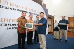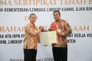 Serang Banten – Rabu (21/1/2026), Kepala Kantor Wilayah Badan Pertanahan Nasional (BPN) Provinsi Banten, Harison Mocodompis, menghadiri kegiatan Serah Terima Sertipikat Tanah Barang Milik Negara (BMN) pada kementerian dan lembaga di lingkup wilayah kerja Provinsi Banten. Kegiatan ini merupakan bagian dari komitmen bersama dalam mewujudkan tertib administrasi, tertib hukum, dan tertib fisik pengelolaan aset negara.