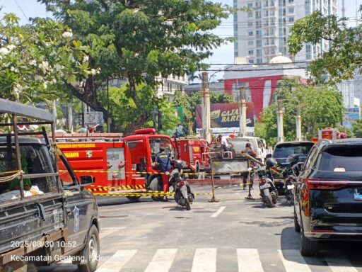 Surabaya – Usai aksi demonstrasi yang berlangsung di kawasan Genteng, Surabaya, Sabtu (30/8) pagi, situasi berangsur kondusif. Sejumlah petugas gabungan dari Dinas Pemadam Kebakaran dan Penyelamatan (DPKP) Kota Surabaya, Satpol PP, aparat kepolisian, hingga relawan masyarakat langsung melakukan pembersihan di lokasi.