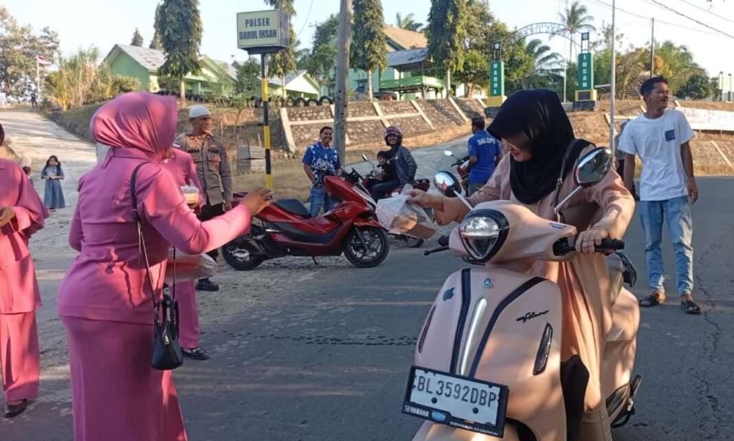 Personel Polsek Darul Ikhsan, Polres Aceh Timur, Polda Aceh dipimpin langsung oleh Kapolsek Iptu Suria Darma, S.H. bersama Bhayangkari Ranting Darul Ikhsan membagikan takjil kepada masyarakat pengguna jalan yang melintas di depan Mapolsek, Sabtu, (07/03/2026) sekitar pukul 17.00 WIB.