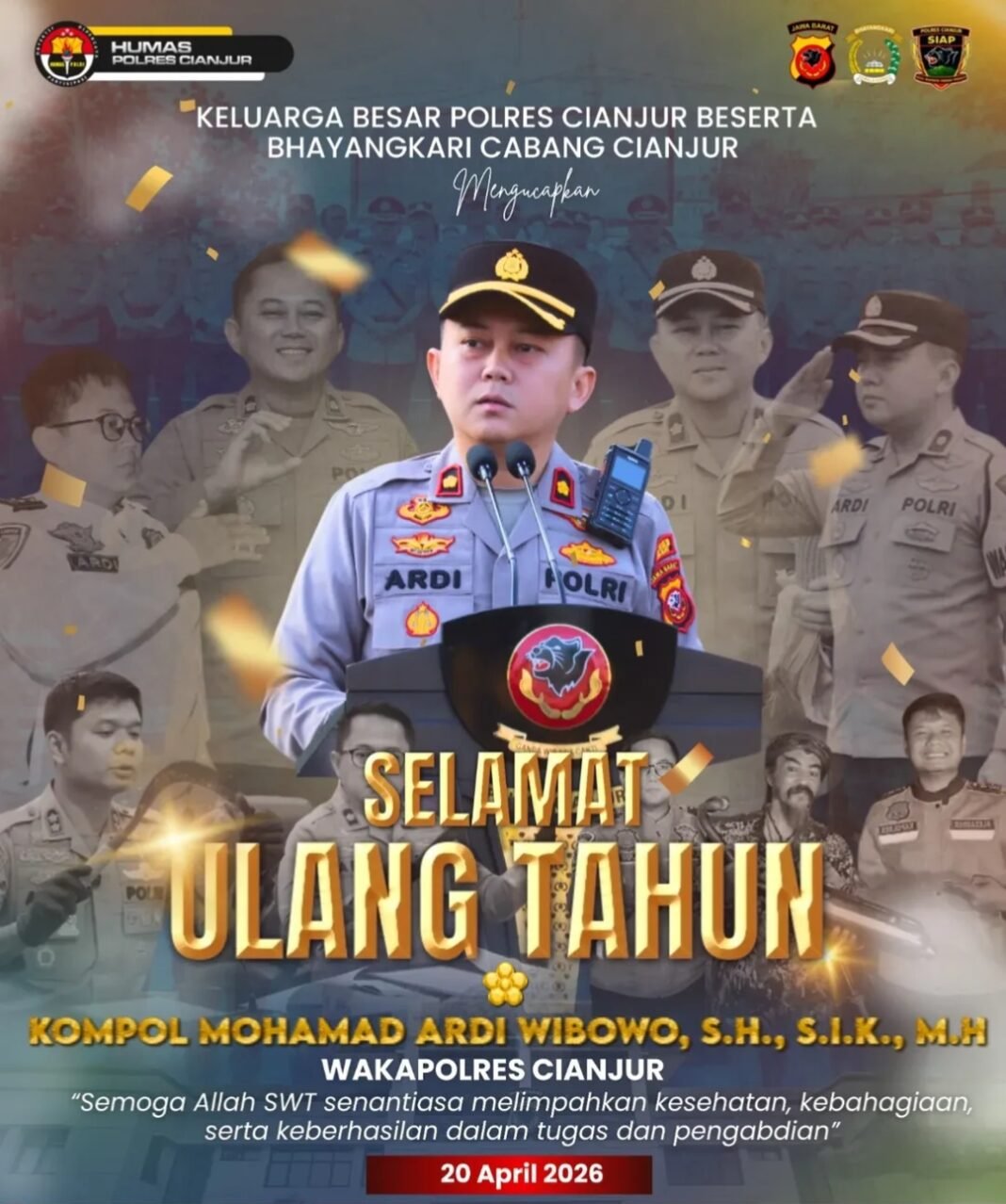 Cianjur, 20 April 2026 — Keluarga Besar Polres Cianjur bersama Bhayangkari Cabang Cianjur menyampaikan ucapan selamat ulang tahun kepada Wakapolres Cianjur, Kompol Mohamad Ardi Wibowo, S.H., S.I.K., M.H.